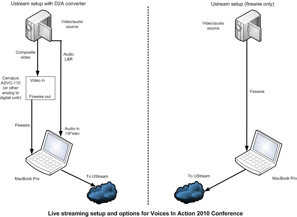 Over the last several weeks I prepped and tested a UStream account that would be used for VIA2010. The result was a pre-configured UStream account, with all video and social media embed codes as well as instructions and diagrams on how to make use of UStream with a Mac and the audio peculiarities (with Camtwist). The audio is always the tricky part in any live event. Other than some minor audio issues early with the mixer equipment provided by the local video crew, the live video streaming and the conference itself was a huge success. The final number on the live stream was 570 viewers, which is quite good considering the minimal marketing efforts…mostly through social media outlets.