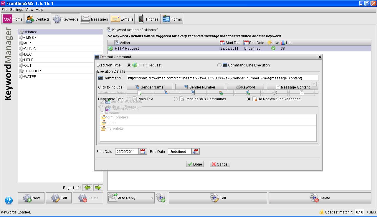 By sending an SMS on it, I totally confirms the sms appears in FrontlineSMS and sent the link which should put it online on our Crowdmap … But checking, nothing happened …